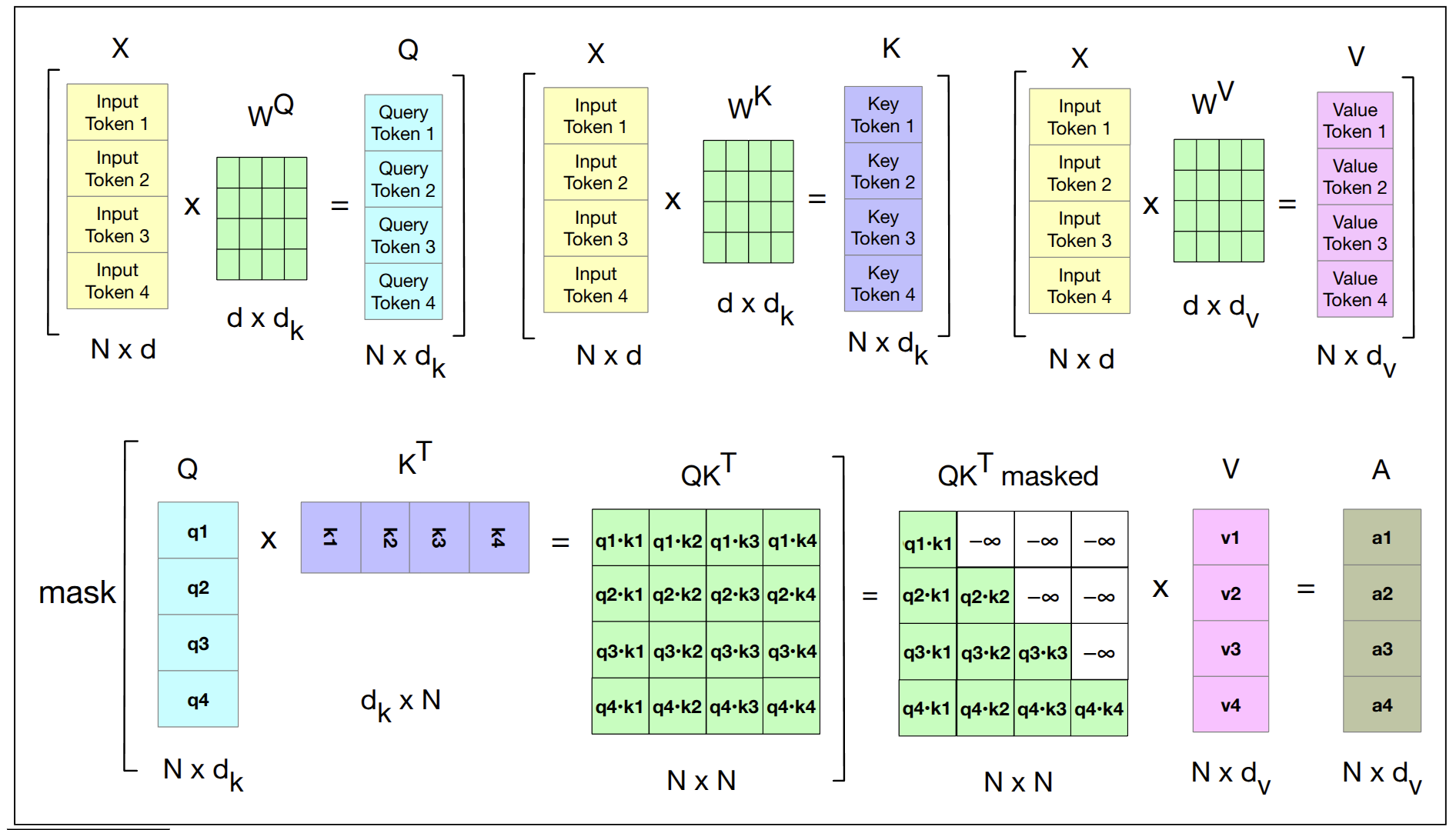 其中\(W^Q \in \mathbb{R}^{d_{\text{model}} \times d_k}\), \(W^K \in \mathbb{R}^{d_{\text{model}} \times d_k}\), \(W^V \in \mathbb{R}^{d_{\text{model}} \times d_v}\)分别是 query,key 和 value 的权重矩阵。