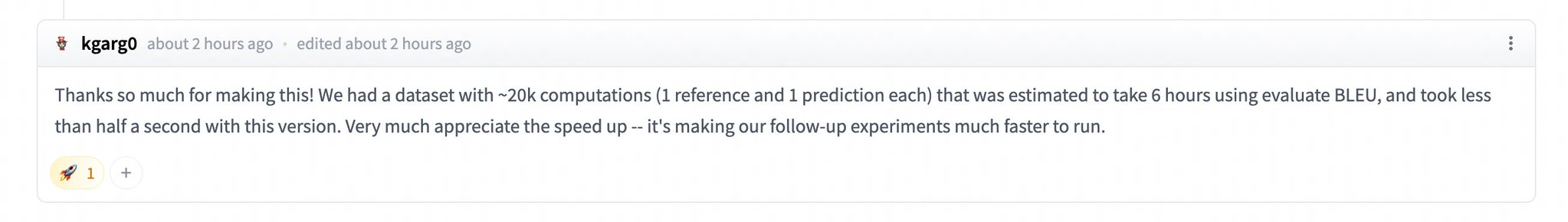 也是去年写的一个 BLEU 计算库 (bleuscore),在前几天又收到 Huggingface 上的一条留言,说之前写的帮助他将评估程序的运行时间从 6 个小时提升到半秒:
