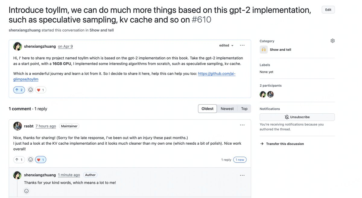 同样地,这些代码也都或多或少地受到了一些好评并帮助了一些朋友。 比如下面和 Sebastian(LLM from Scratch 作者) 的互动 (当然这位大佬本身就很友善):