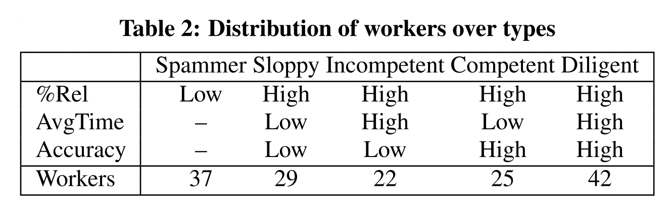 | Diligent workers | Diligent workers take care in completing their HITs and may thus be characterized by a high ratio of useful labels, longer average time spent per HIT, and a high label accuracy. |