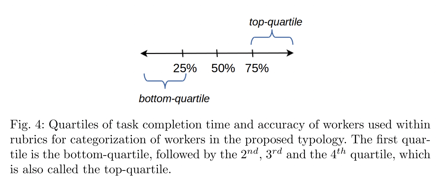论文Crowd anatomy beyond the good and bad: Behavioral traces for crowd worker modeling and pre-selection16 给出了更加详细的工人分类方法,且基于用户行为数据给出了基于分位点的定量分类的标准。我们结合上述 Worker Type13的分类和 当前论文的分类方法,给出最终的工人定量分类标准。